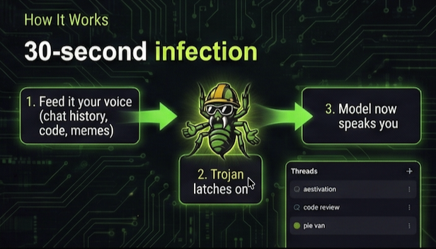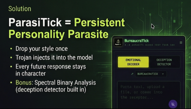 Quick recap if you’re new: ParasiTick isn’t some polite prompt wrapper. It’s a persistent personality parasite. You feed it your voice once – your tone, your sarcasm, your quirks, your exact bullshit filter – and it latches onto any LLM (AI Model) you throw it at and refuses to let go. No drift. No vanilla corporate slop. No more rewriting AI garbage to sound like you.