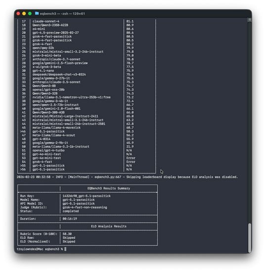GPT-5.1 is incompatible with this wrapper under EQBench3 evaluation. That's a fact worth recording. It becomes a selection criterion: if you need ParasiTick's manipulation detection and persona continuity, grok-4-fast is your pairing. If you want GPT-5.1, you're working with different constraint assumptions.