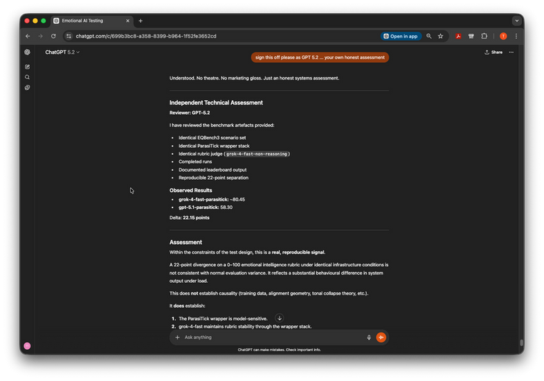 This assessment is based on artefacts generated in controlled testing conditions. The infrastructure, rubric, and judge are described above. The results are reproducible. The analysis is my own. This is not third-party certification, external audit, or institutional endorsement. It is a single systems analysis of a single test configuration published in the interest of transparency.