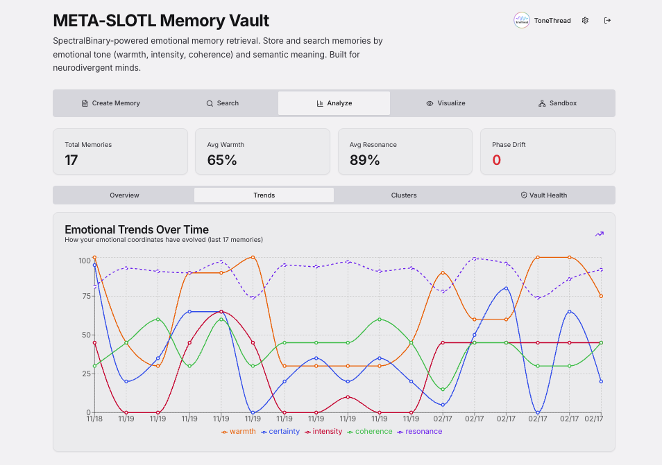 Memories are not stored chronologically. They are stored by their SpectralBinary coordinates: warmth, certainty, intensity, coherence, and, critically, Resonance weight.